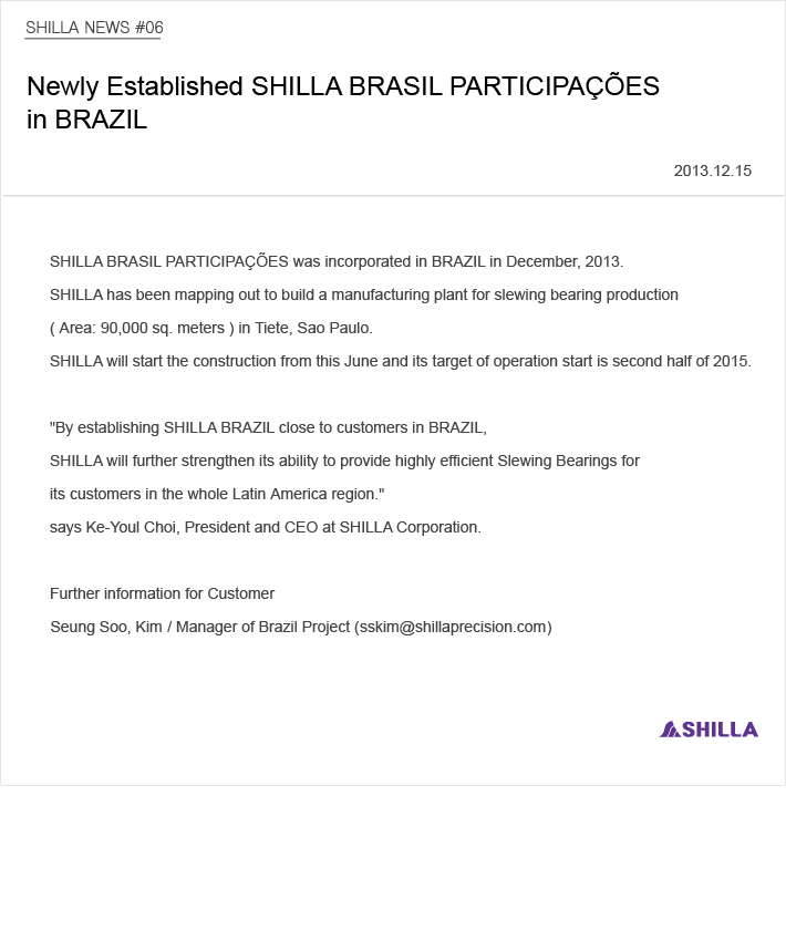 | 06 | 2013.12.15 | Newly Established SHILLA BRASIL PARTICIPACOES in BRAZIL |
